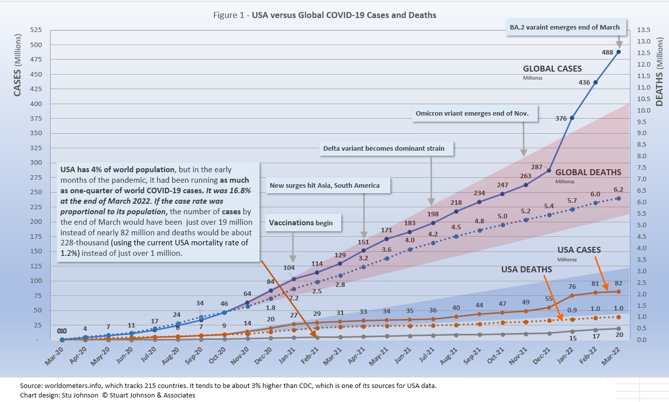 Earlier in the summer of 2021, I indicated that with vaccinations in progress and expected to be completed in the U.S. by the end of summer, the end of COVID-19 could come sooner. Like 1918, however, there have been major complicating factors, such as the combination of the delta and omicron variants with a high number of unvaccinated (ironically hitting hardest in Europe and USA where vaccines are readily available). While we may have thought the end of the pandemic was in sight, it is still too early to make predictions on the duration and severity of the COVID-19 pandemic globally. Indeed, when I commented on the curve for cumulative cases in December, said it looks like the trajectory of an airplane climbing toward cruising altitude. From January through March,, however, it looks more like a rocket headed toward orbit!