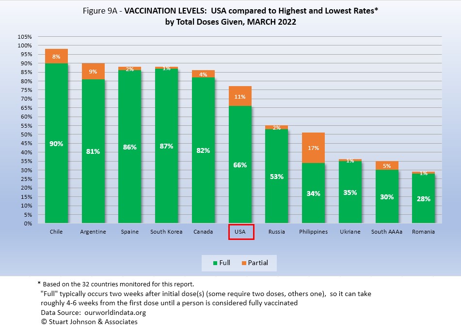 In addition, in early November 2021 the CDC expanded vaccination approval for children ages 5-12 and in December 2021the FDA approved the first anti-viral drug, Pfizer's Paxlovid. Despite that, USA fully vaccinated stands at 66%, not bad compared to other large countries, but well behind the best among the 32 countries monitored for this report (see Figures 9A and 9B above).